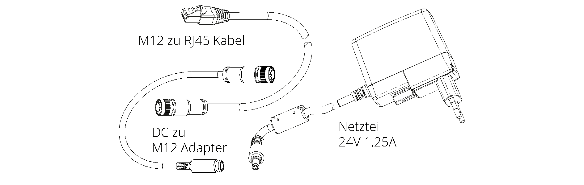 Roboception bietet ein optional erhältliches Anschlussset an, um Kunden bei der Einrichtung des rc_visard NG zu unterstützen. Bei dauerhafter Installation muss der Kunde ein geeignetes Netzteil bereitstellen. Das Anschlussset besteht aus folgenden Elementen: