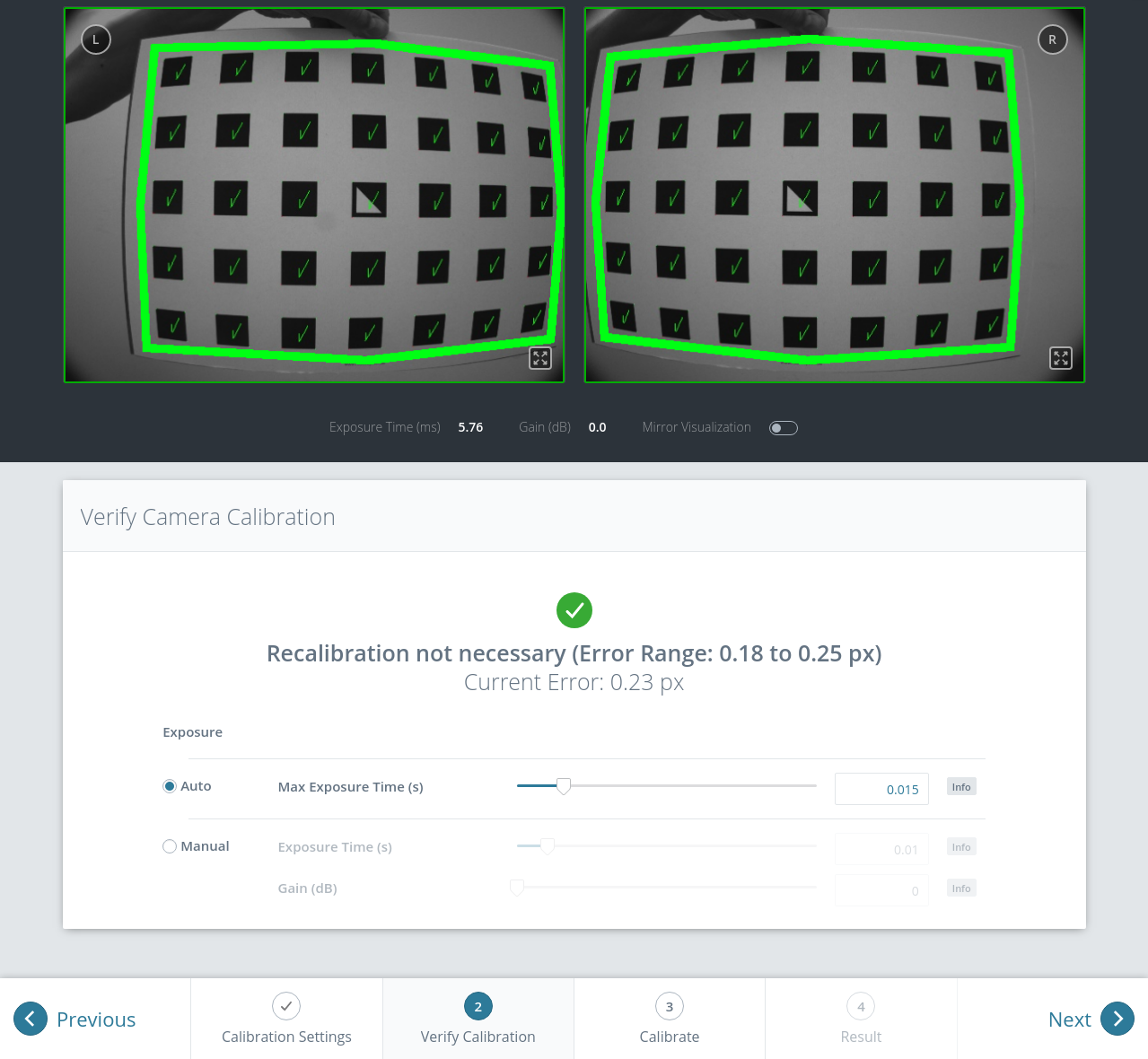 Full calibration consists of calibrating each camera individually (monocalibration) and then performing a stereo calibration to determine the relationship between them. In most cases, the intrinsic calibration of each camera does not get corrupted. For this reason, monocalibration is skipped by default during a recalibration, but can be performed by clicking Perform Monocalibration in the Calibrate tab. This should only be done if the result of the stereo calibration is not satisfactory.